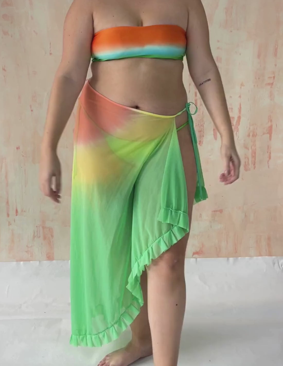 Our Calm beach wrap is versatility at its finest. This stunning art piece has many uses: a strapless, one-shoulder, or halter-style dress, a cape, or a skirt. It features soft, airy tulle fabric with a ruffle trim that adds movement and elegance to any outfit, dries quickly, and weighs almost nothing, making it a travel essential!