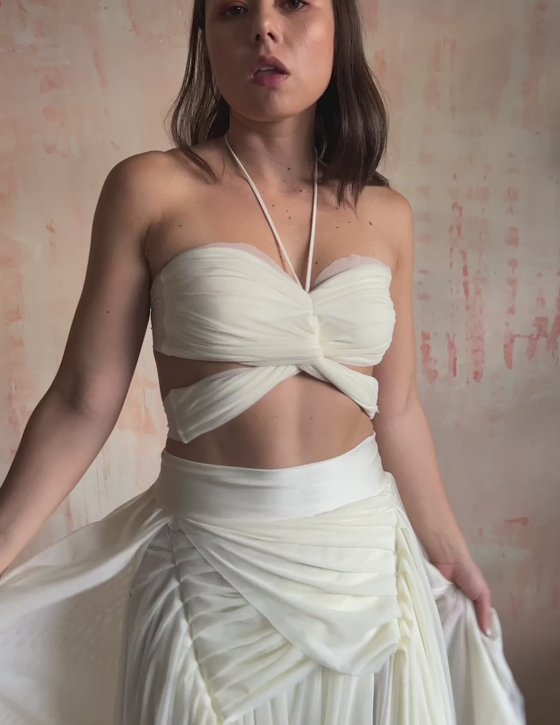 Our Mariposa crop top features a halter neckline with cutouts on the side. Its tulle fabric makes the garment look elegant and luxurious. The silhouette is made to lengthen your torso.