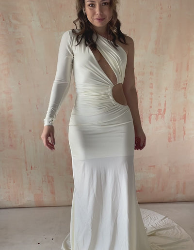 Aphrodite is an asymmetrical, one-sleeve silhouette with gorgeous cutouts! This unique, sophisticated piece will make a great addition to any wearable art collection. Perfect for your most special moments…