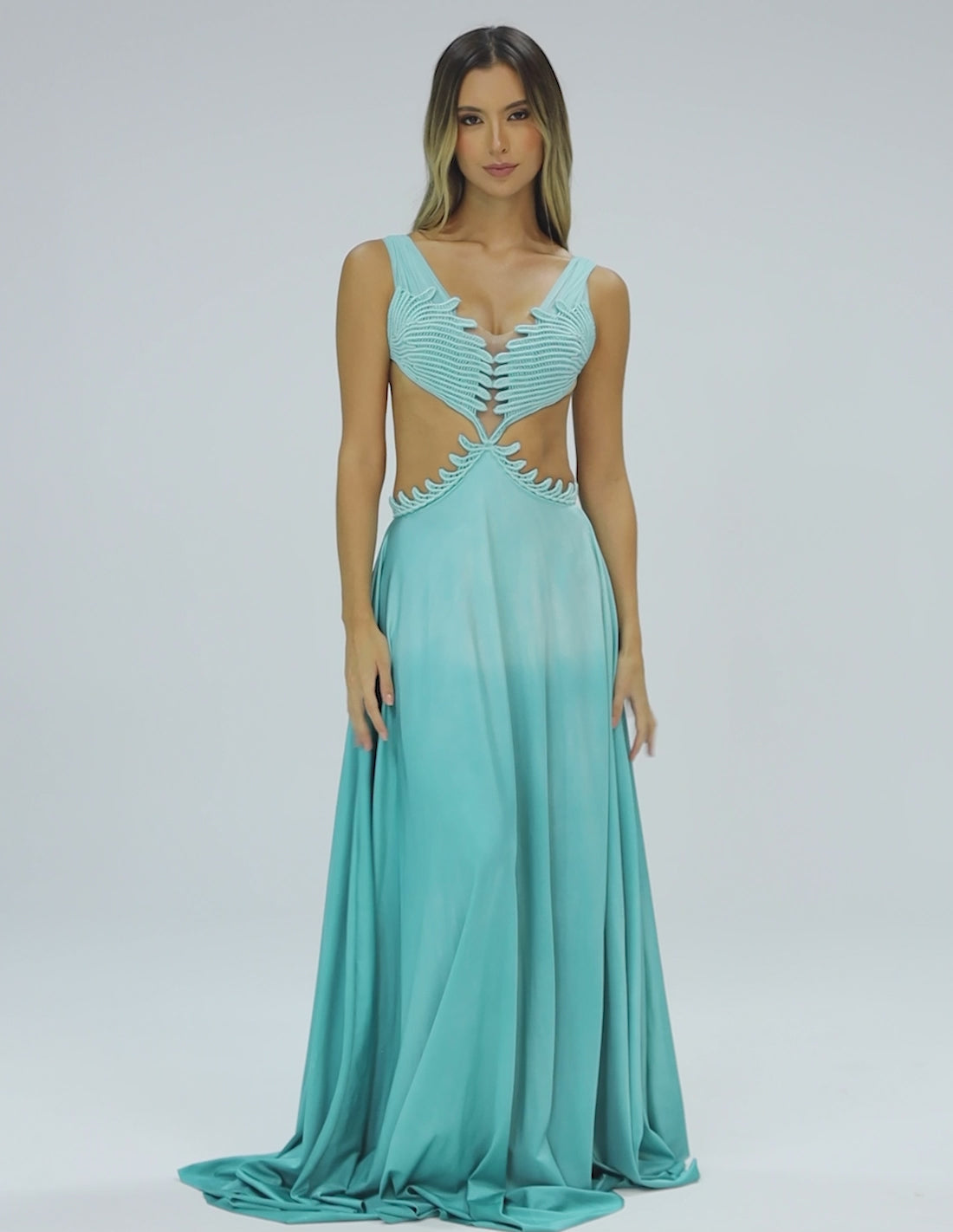 The Wings is a macramé masterpiece with sensual cutouts and elegant tulle straps. The free-flowing skirt will allow you to move freely and dance to your heart's content. Ready to wear art for any occasion. If you're looking for sparkle, choose Wings Glow! Made with Murano crystals.