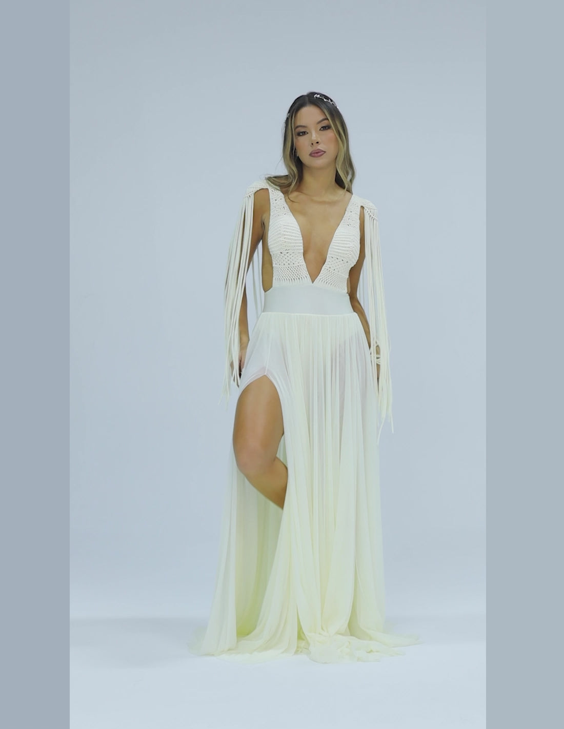 The Atenas dress... a one-of-a-kind gown! Features: a plunging neckline, wide waistband, tulle skirt, low-back design, thigh-high slit, a macramé woven bust, and shoulder pads. The flowing tulle skirt and fringe that extends beyond your arms create a dramatic silhouette that makes you the spotlight of any event.
