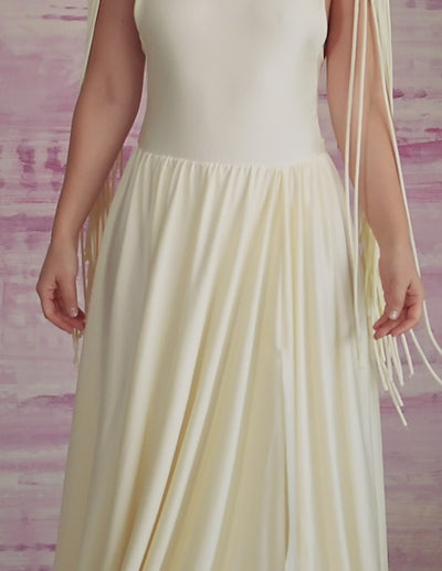 Atria... an elegant dress with a modest neckline, shoulder pads with fringe that gives it movement, and a low-back design with two macramé leaves woven on the straps. The skirt flares at the waist with a thigh-high slit on the left leg.