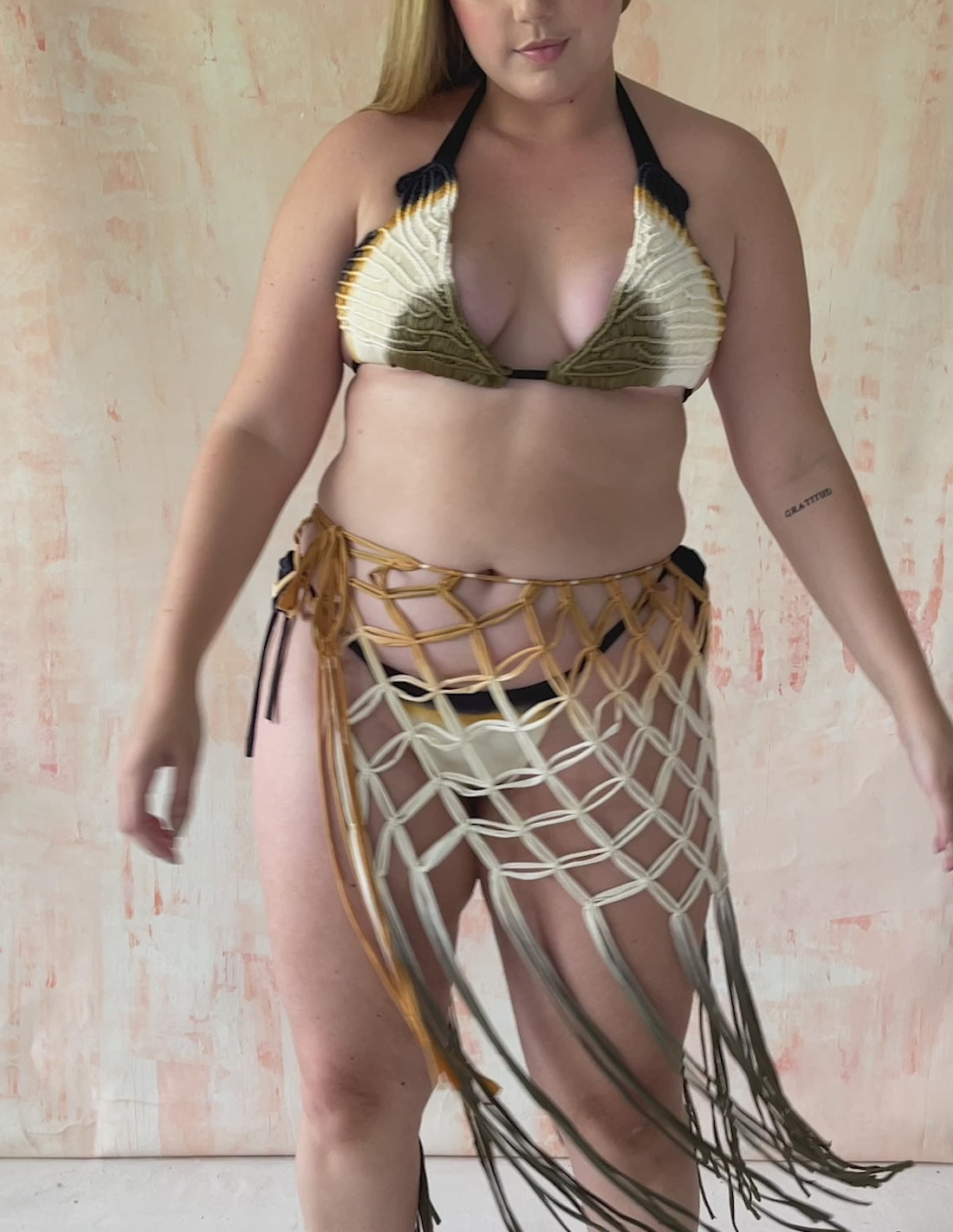 The Santorini is a best-seller among our art collectors! This cover-up skirt is a textural paradise that adds a memorable touch to your swimwear outfits. It features an adjustable tie strap (at the waist) and a stunning fringe detail. Its versatility creates more outfit choices... try it for a striking festival look!