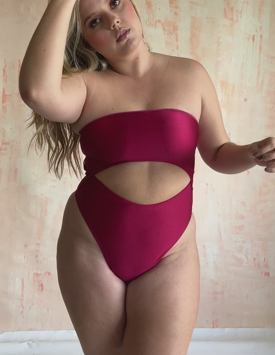 Our sophisticated Infinite one-piece has a strapless neckline with a slip design and removable cups. It features a stunning macramé detail on the back, a bandeau cutout to lengthen the torso, and a high leg cut for the illusion of longer legs. The bottom has a scrunch detail to accentuate your curves and give you a rounder, fuller look.