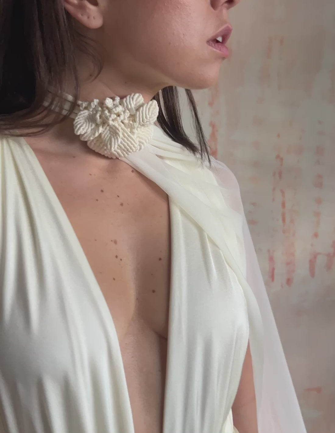 Our Fluorescent is the perfect accessory for your artsy outfits. It features a macrame flower motif on the band that ties at the neck. It also has tulle fabric that sits on top of a shoulder. Wear it with a bikini, a dress, or a strapless crop.