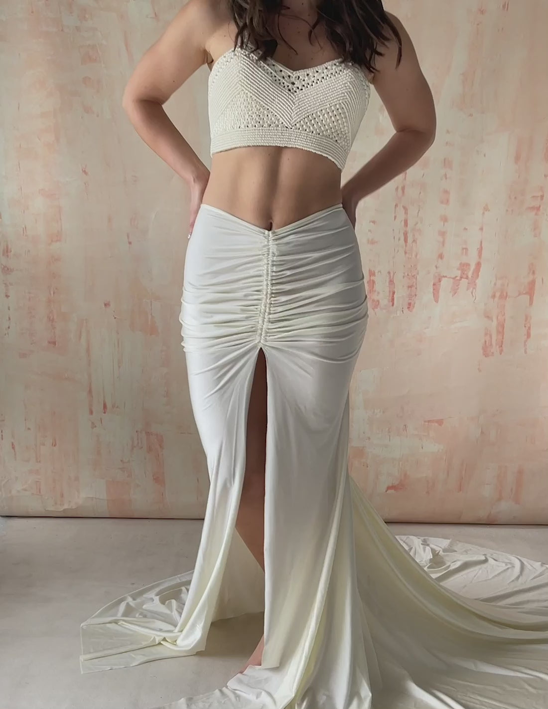 Our Daisy skirt is a piece with a close-fitting silhouette at the top which will highlight your hips. The draped design and high slit are touches to show off at elegant events. It is as unique as our collectors! Perfect for your most special moments…