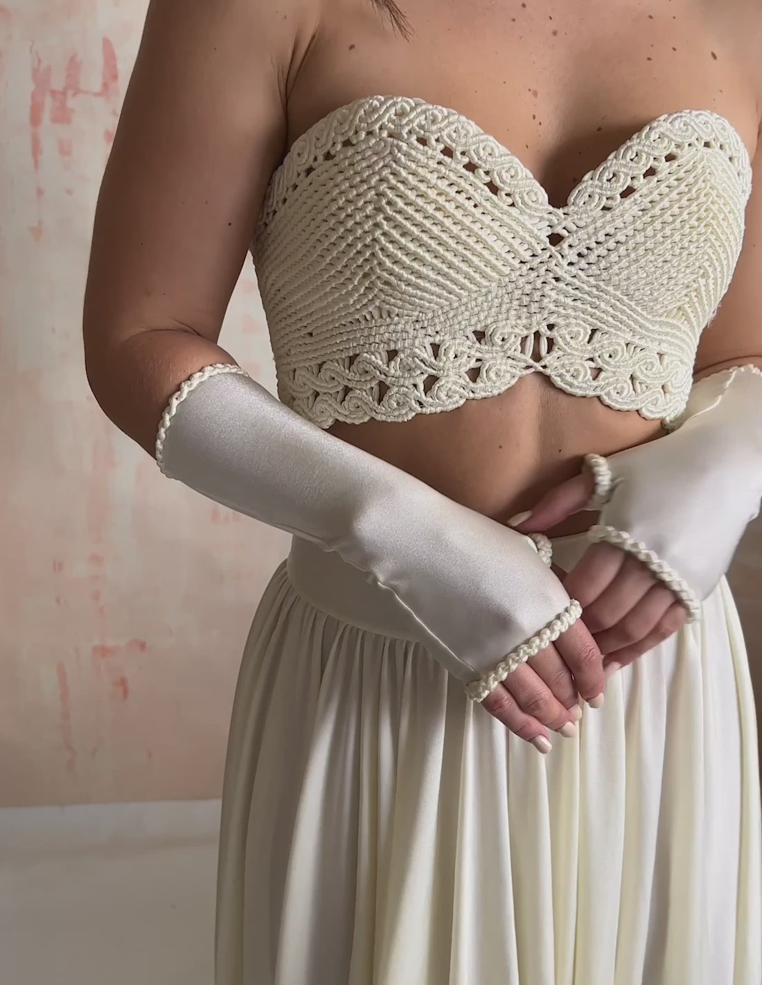 The Queen sleeves are detachable accessories to enhance any sleeveless top or dress. Queen 2 features a fitted fingerless design with thumb holes and macrame hems in a satin finish.