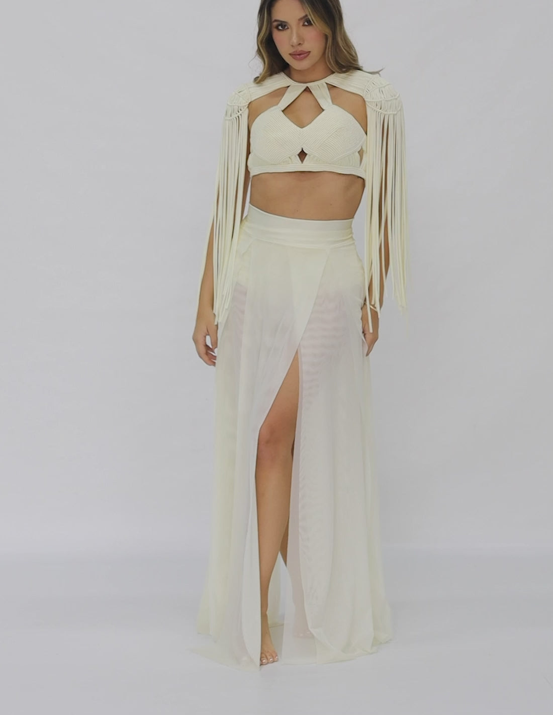 The Woods skirt features thigh-high slits and a dramatic A-line fit. It's the same silhouette as the Stripe but has two layers of tulle fabric instead. Its versatile translucent block fabric allows you to tie it in numerous ways and even turn it into a dress!