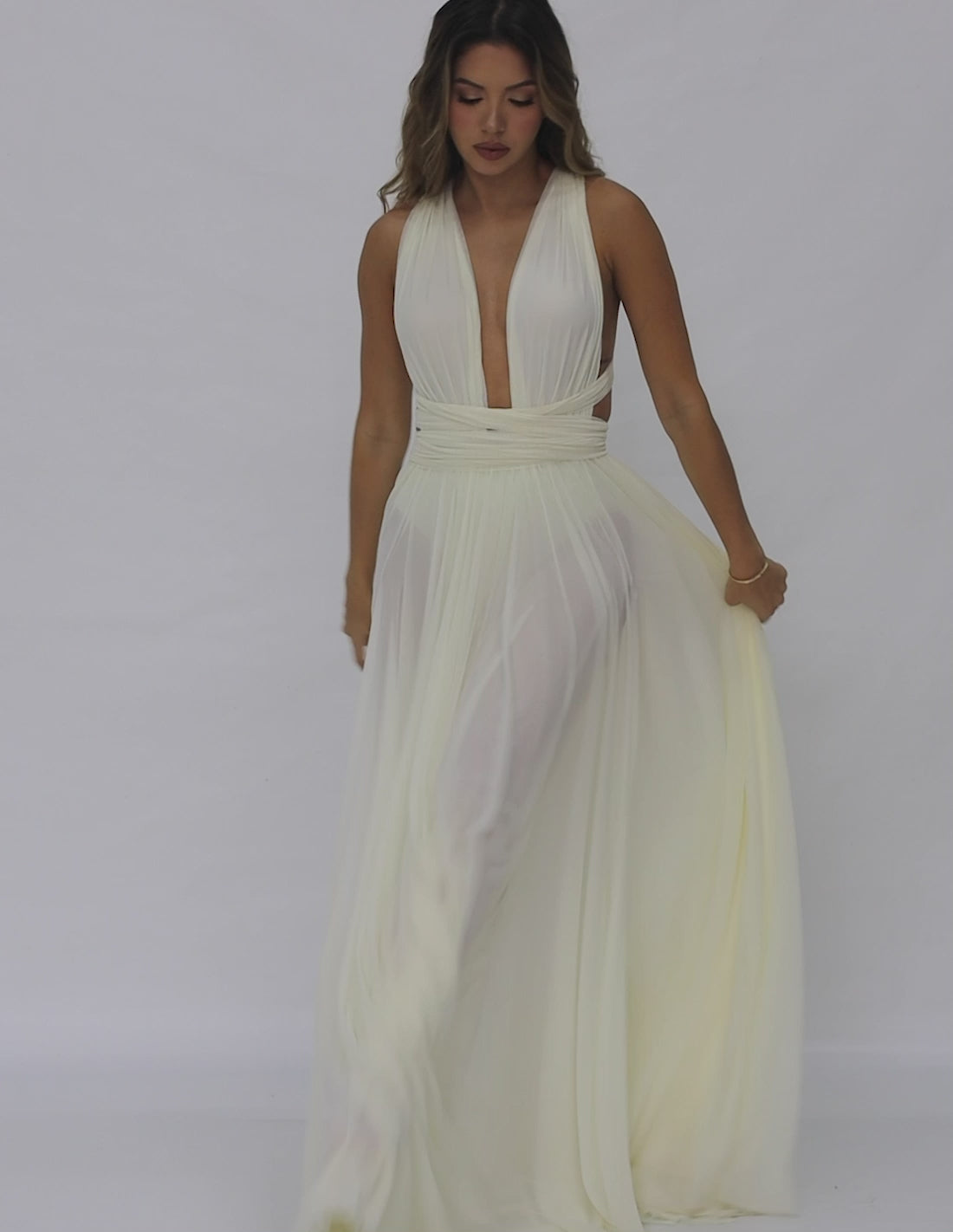 Our Hydra dress: versatility at its finest! Its structure consists of two long tulle straps forming a deep-V neckline attached to the long picturesque tulle skirt. Try it yourself and invent new ways to wear this elegant art piece.