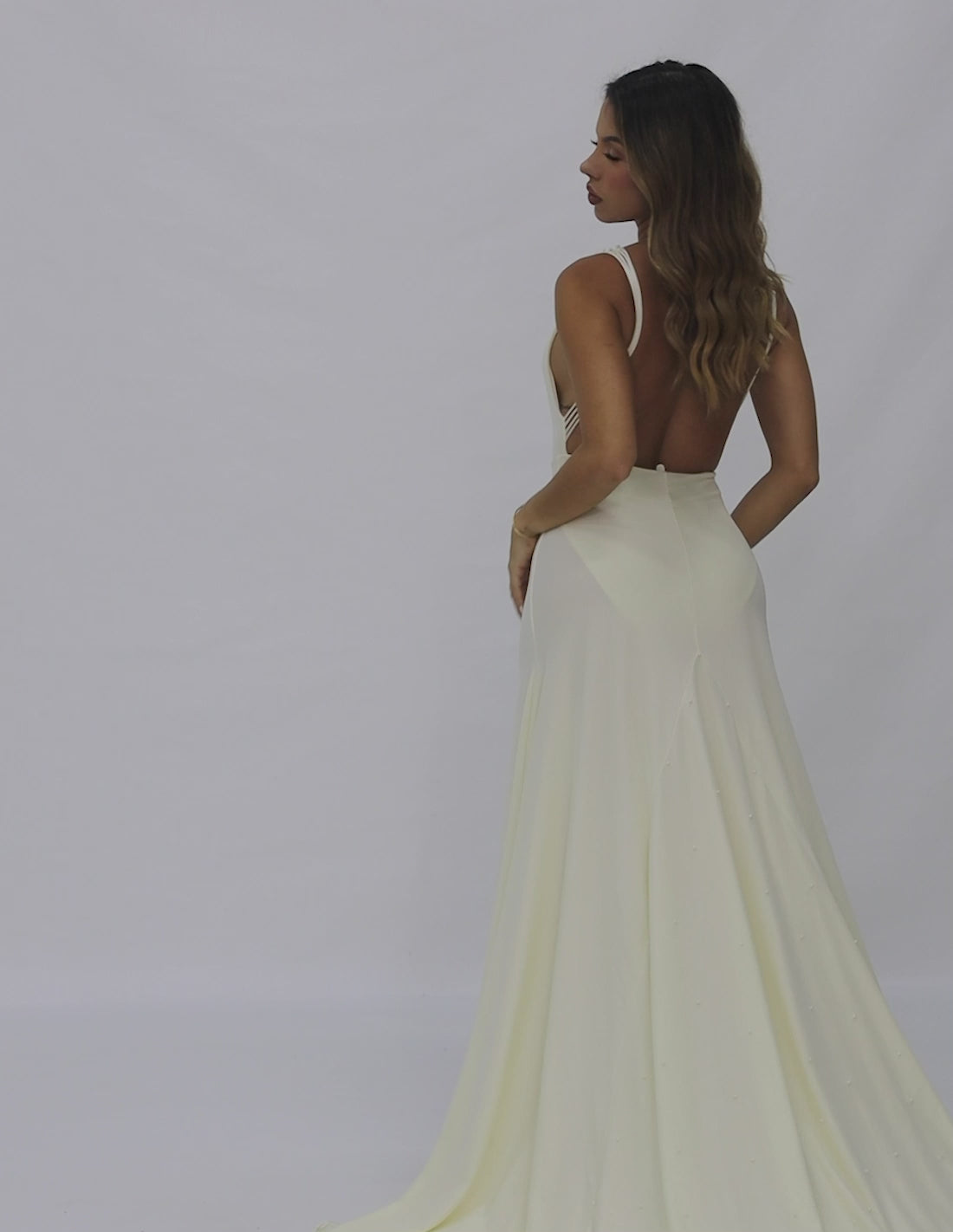 The Petale gown is an art piece that embodies simple elegance with a gorgeous long train. It also features a V neckline, a low-back design, and thin straps on the back in a style similar to the mermaid skirt fit. Classy and refined, the perfect dress for any formal event. If you're looking for sparkle, choose Petale Gloss! Made pearls.