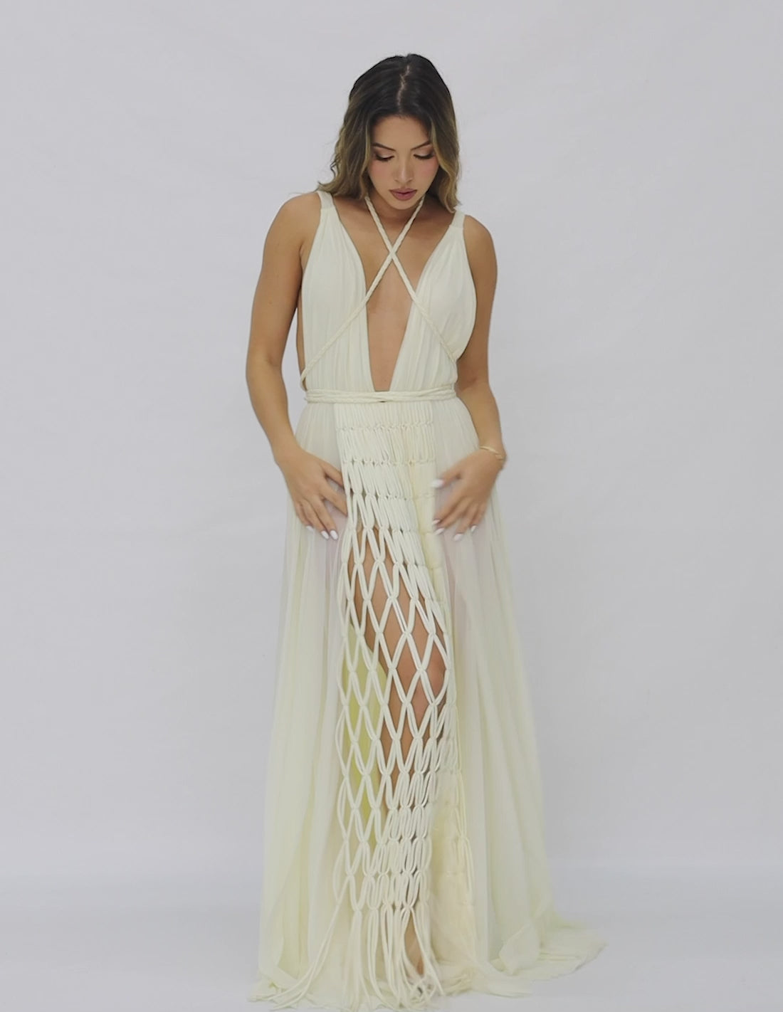 The Diosa gown, noted in its name, will make you feel like a goddess! It features a plunging neckline, a low-back design, thigh-high slits, a tulle skirt, and a braided accessory to tie multiple ways.