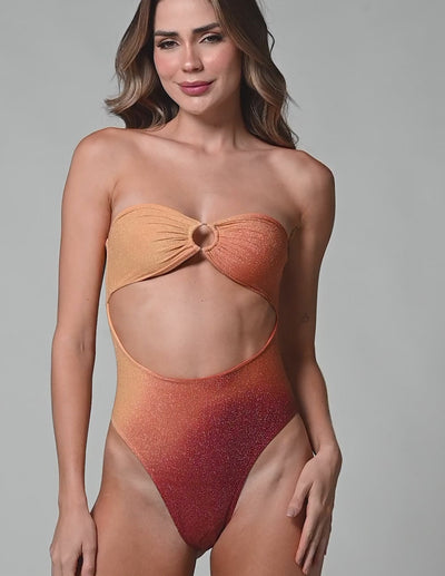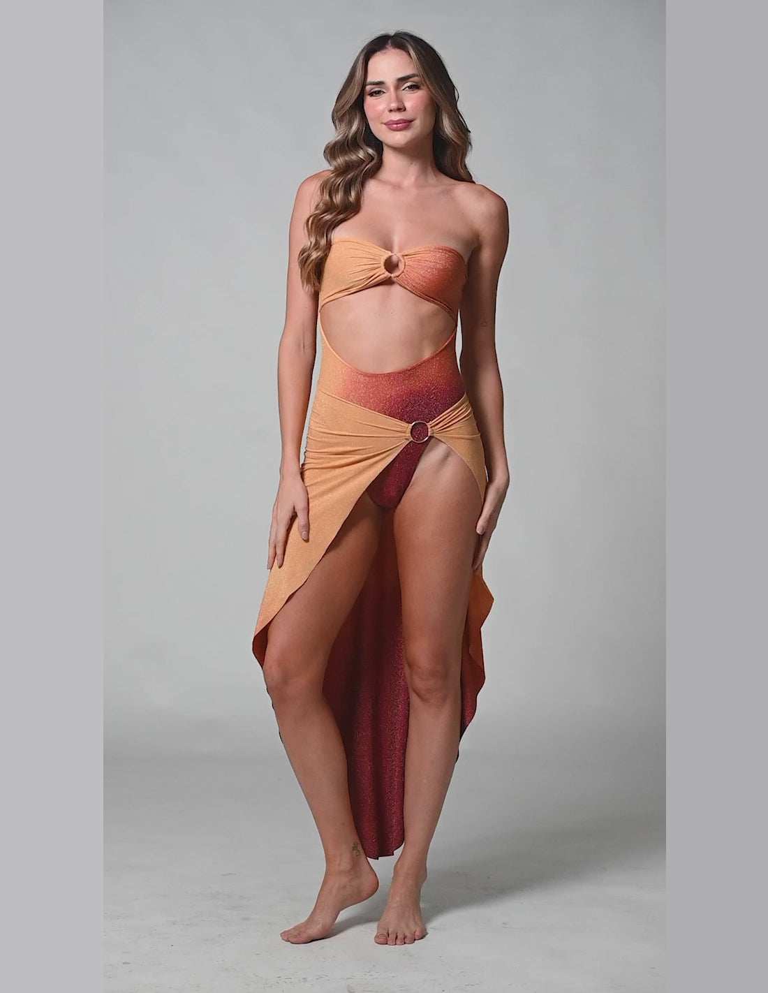 This outfit combines two pieces designed to highlight the silhouette with elegance and a touch of sensuality. The one-piece features a ring detail joining the cups, an abdominal cutout, and a high-cut leg, all crafted in our shimmering fabric that hugs the body beautifully. The skirt has an irregular cut that reveals the legs, with layered fabric joined by a ring that enhances the figure and perfectly complements the look.