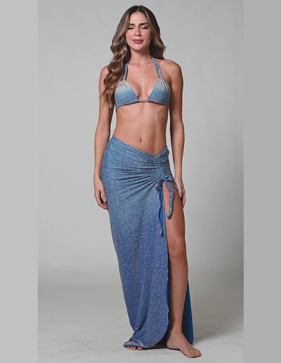 This outfit brings together a top that enhances the bust with removable cups and a silver–shimmer fabric, paired with an adjustable side-tie panty that elongates the legs, and a versatile skirt that can be styled in multiple ways for an elegant and streamlined look. A combination designed to highlight your figure and make you shine anywhere.