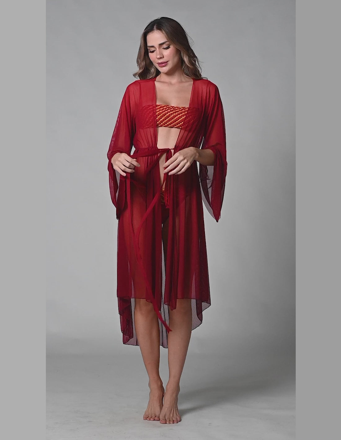 Eni Kimono: Made of tulle for flow and movement, adjustable at the waist, and easy to style with casual looks such as denim or shorts.