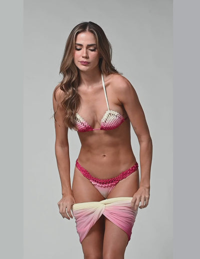 The hand-knotted macramé top creates a perfect balance between structure and allure, embracing the neck and back to generate a natural push-up effect. The panty, with its woven waistband, reveals the skin in a subtle and magnetic way and can be worn higher on the waist to visually elongate the legs. The lightweight, quick-dry tulle pareo elevates the look with a V-shaped effect that refines the figure and adds movement, turning this outfit into a true statement piece within your collection.