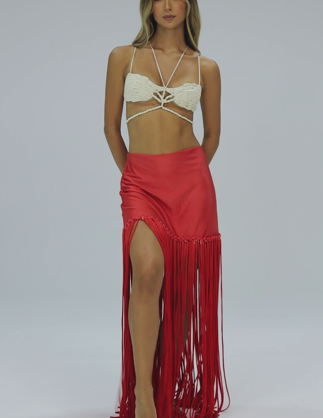 Our Aloha skirt, born from our Aloha dress, is for those who prefer to have two separate pieces. Our skirt fits at the waist and has that fringe we love and that will give movement and charm to your outfit. You can add different croptops or bodysuits from our line to match the skirt and pair it to your liking!