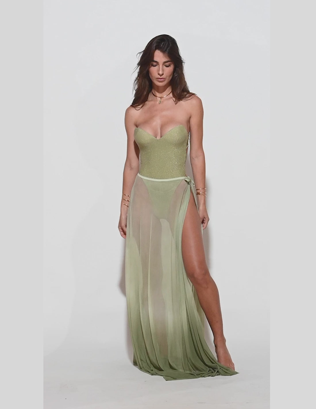 The Glint sarong designed in tulle, wraps your silhouette with a delicate transparency, its long cut adds a touch of elegance and fluidity, perfect to accompany your beach look or give a sophisticated touch to your bikini, the perfect complement to the Gleam piece.